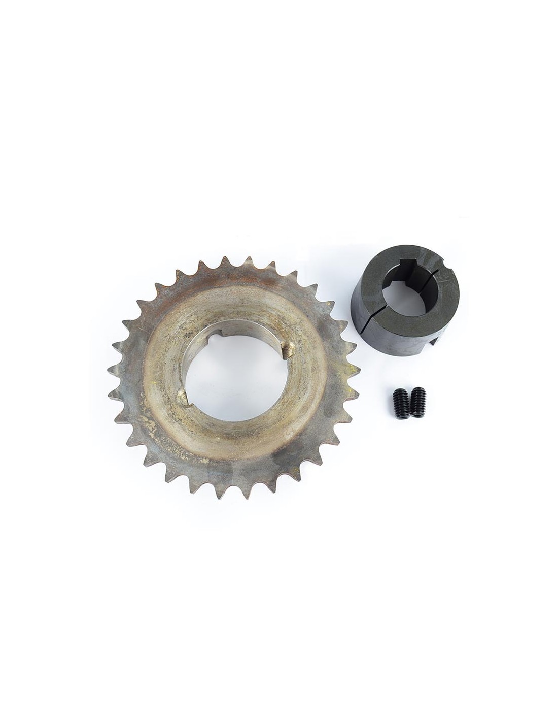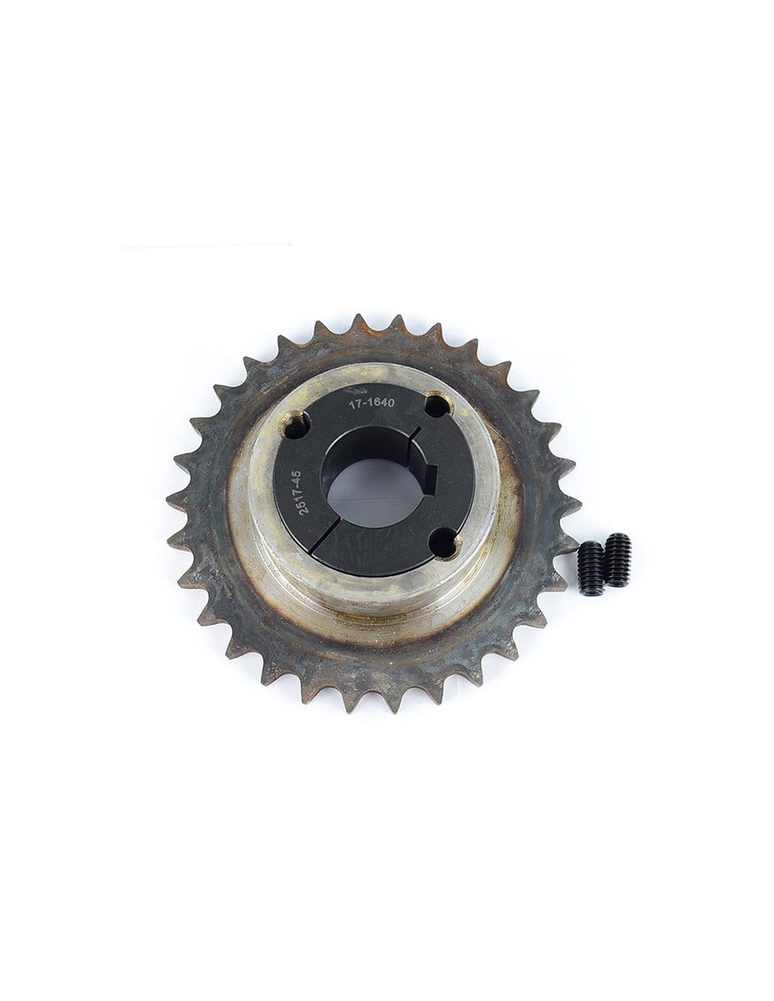 Piñón TSUBAKI de 30 dientes y “cierre cónico TAPER de SKF” eje 45 mm con chavetero, tornillos de sujeción y dientes templados, endurecidos para un mayor durabilidad, para cadena reforzada ASA 60H-1. Normalmente utilizado en la tracción de los sacudidores de la vendimiadora